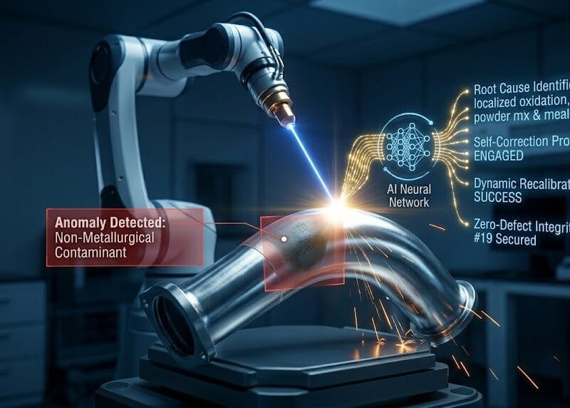 Instead of a simple “Parameter Adjustment,” the AI determines the root cause and implements a multi-variable solution. For example, if a localized contamination zone is detected on a critical aerospace housing (Article #58), the AI may decide to instantly modulate the Functionally Graded mix (Article #64) and shift the laser pulse geometry to vaporize the contaminant before bonding the new cladding layer.
